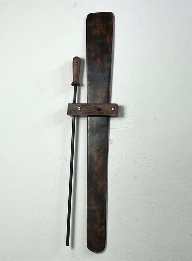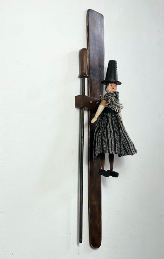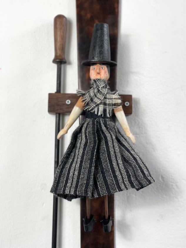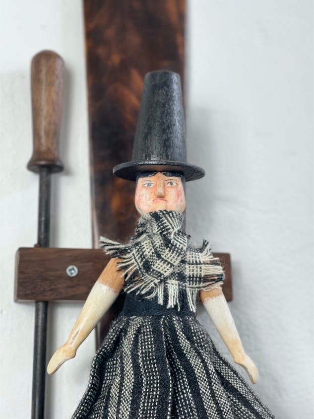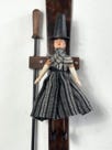 Mabli the Welsh woman jig doll based on a traditional jig doll design with articulated legs and moving arms . She has ebony shoes. Her body is made from beech and walnut and turned on a wood lathe. Hand painted with traditional Welsh costume and hat . She is wearing a traditional Welsh flannel shawl and skirt with cloth supplied by Carpenter and Cloth. She comes with her own display block and stick along with a scorched maple dancing paddle.