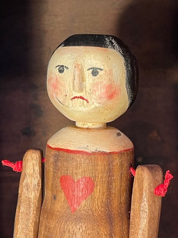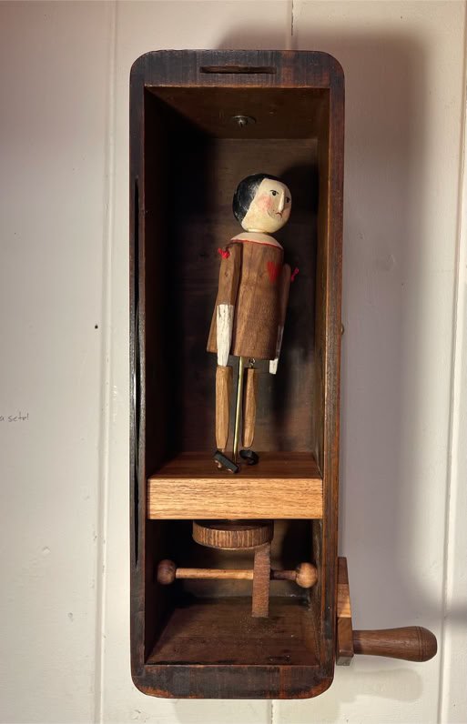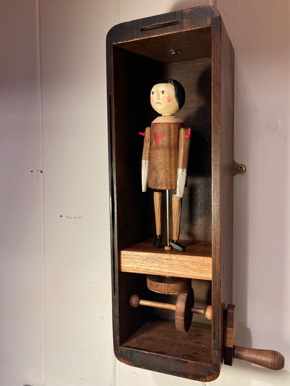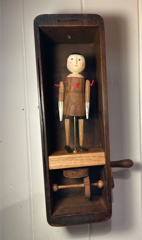 This is Valentine a hand made Walnut articulated figure with a heart on her dress and ebony shoes . Housed in an vintage sewing machine drawer. Turn the handle and the figure twirls.